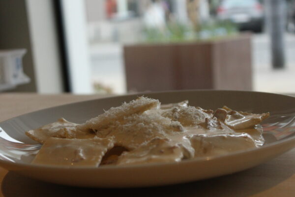 Nos raviolis à la viande maison, accompagnés de notre sauce du Chef : crème, jambon et champignons.
